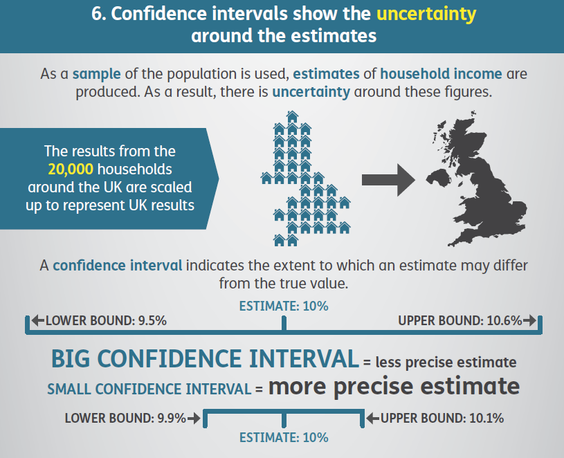 4.16.4 An example where uncertainty in the form of confidence intervals has been explained using an infographic is in the Households Below Average Income Report, ONS :